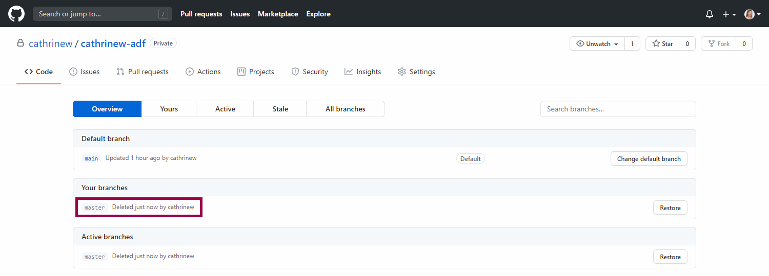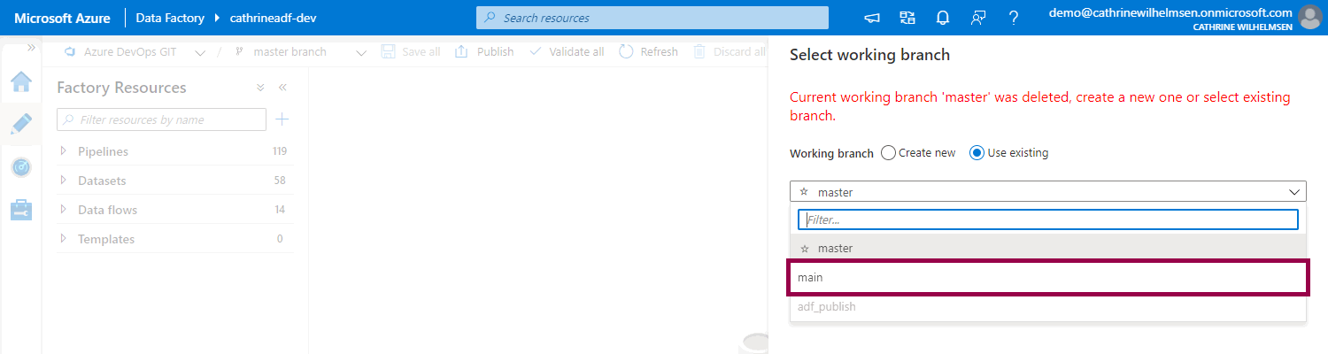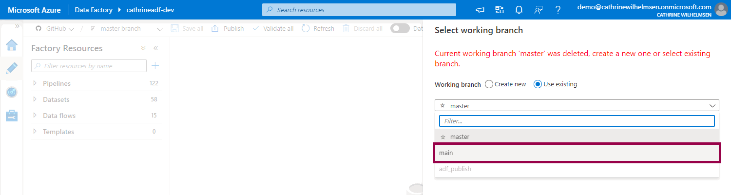 Open or switch back to your Azure Data Factory. If you get a notification that the current working branch was deleted, use the new “main” branch instead: