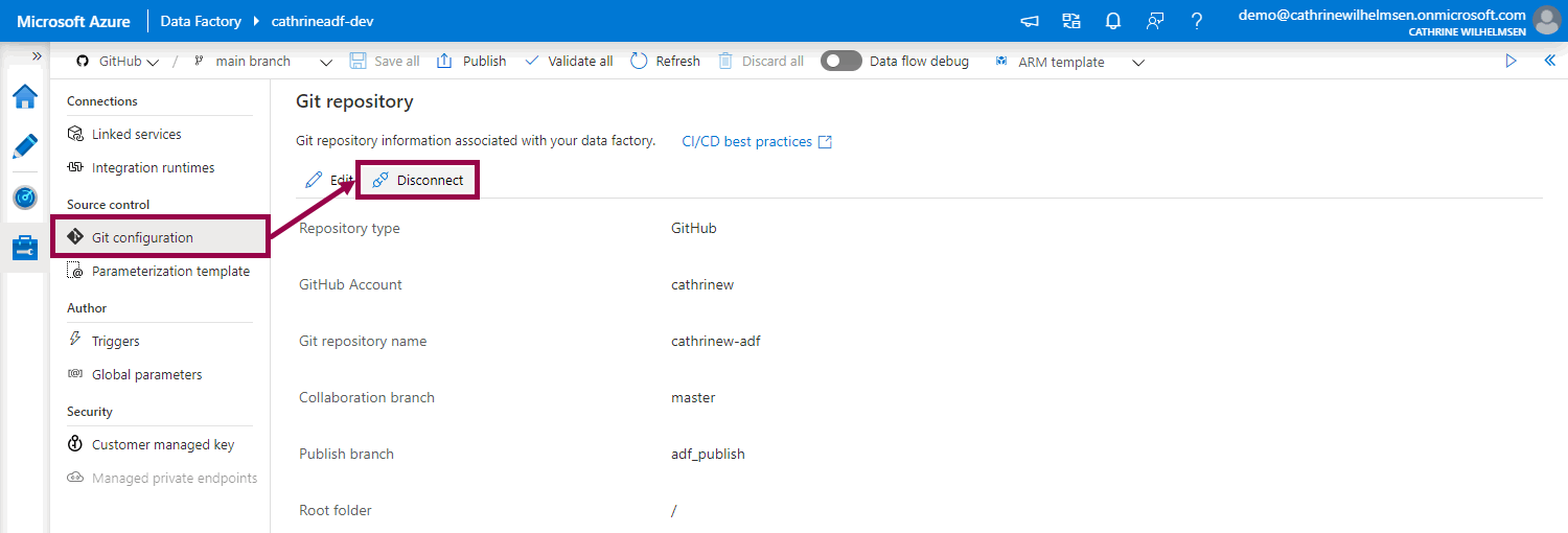 - Reconnect to your Git repository in Azure Data Factory using the new “main” branch as the collaboration branch