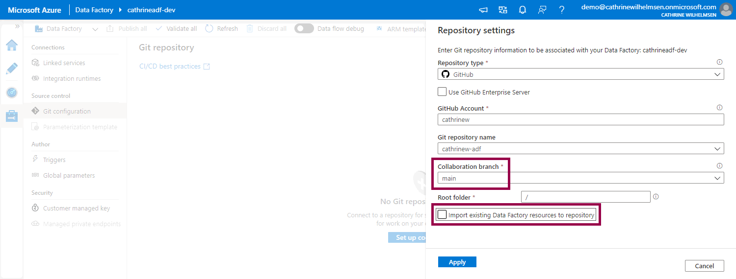 Select the new "main" branch as the collaboration branch and make sure you uncheck Import existing Data Factory resources to repository. This ensures that you keep what is in the “main” branch as-is. Then click on Apply: