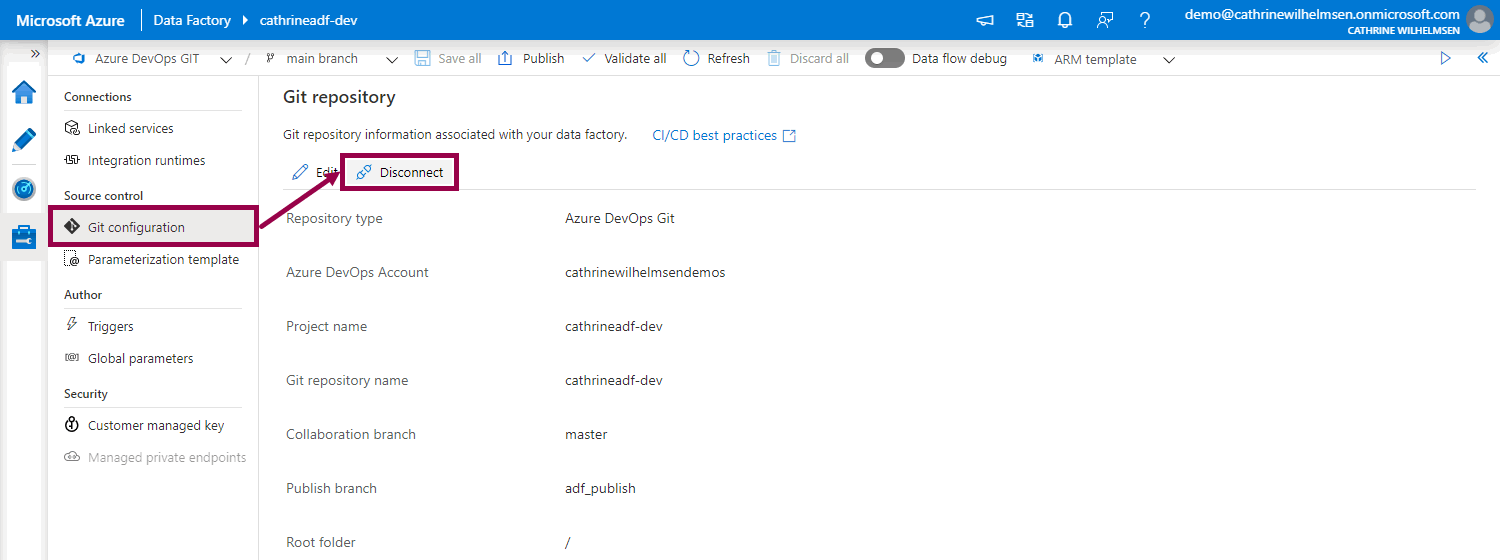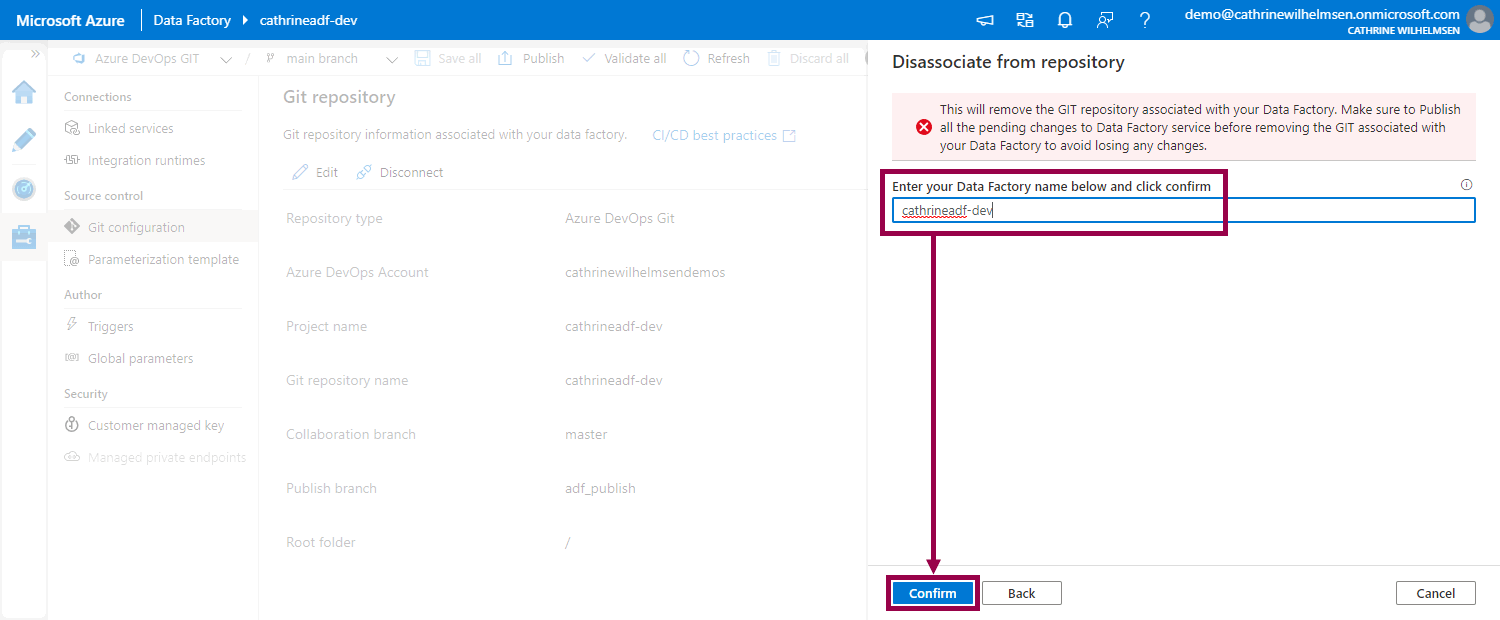 You will see a warning that you should publish all pending changes before disconnecting to avoid losing any changes. I always recommend that you do this just in case, but since we will immediately reconnect to our Git repository, you don’t have to do it in this case. Type the name of your data factory and click on Confirm: