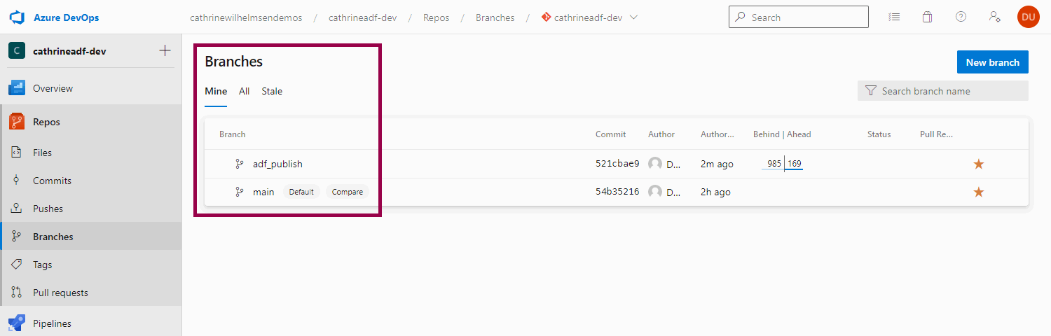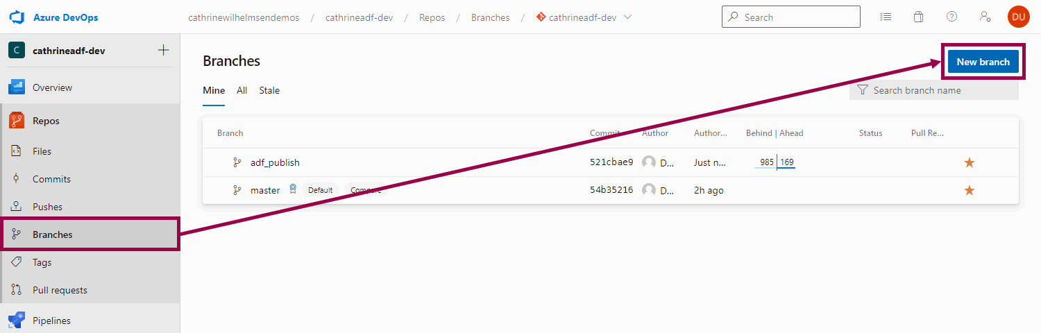 Open your Azure Data Factory Git repository in Azure DevOps. On the Branches page, click on New branch: