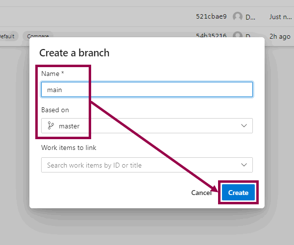 Type “main” as the new branch name, base it on “master”, then click on Create: