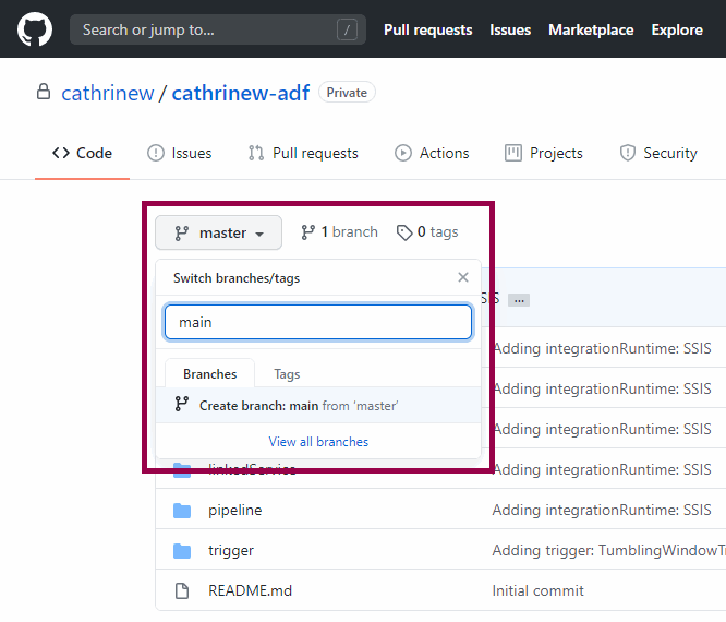 Open your Azure Data Factory Git repository in GitHub. On the Code page, click on the branch dropdown where it says “master”. Type “main” as the new branch name, then click on Create branch: main from master: