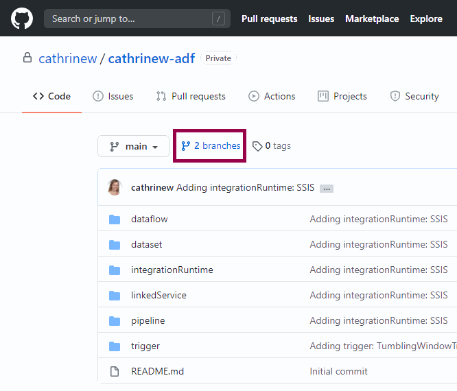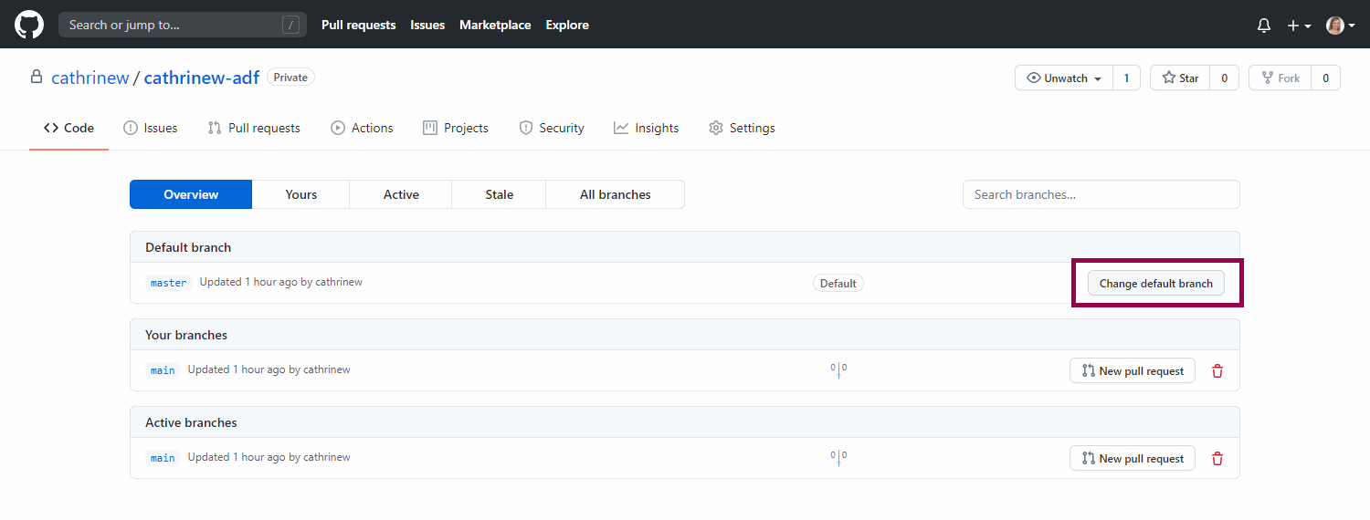 That’s it! The new “main” branch is now the collaboration branch and has a star icon next to it in the branch dropdown: