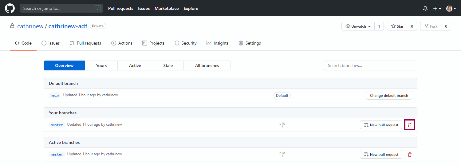 Back in the branches overview, click on the delete icon next to the “master” branch to delete it: