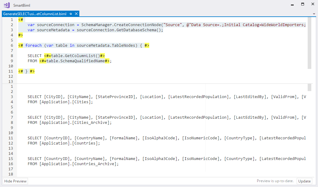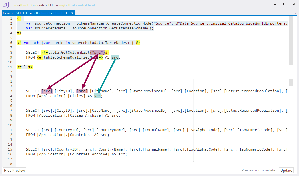 In a previous blog post, we looked at how to generate SQL using Biml. (If you haven’t read that post, you may want to start there and then come back here.) In this post, we will go through how to generate SELECT statements using the Biml column method GetColumnList.
