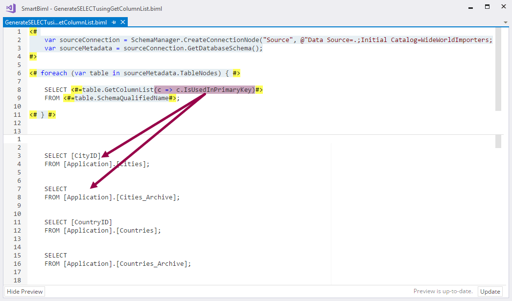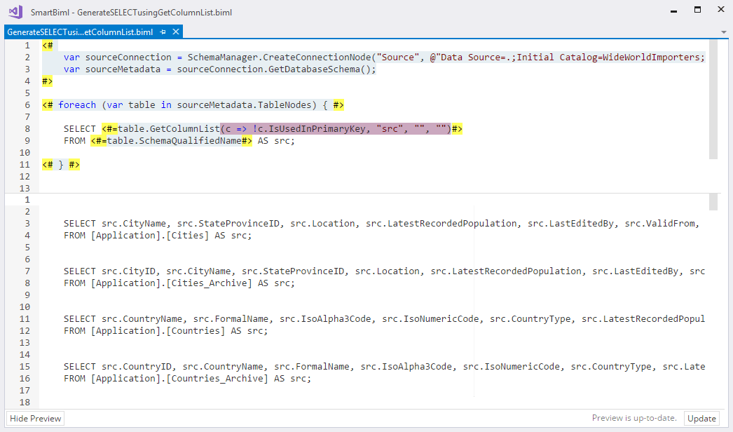 You can generate custom SELECT statements in Biml by using the column method GetColumnList. In addition, by passing in one or more parameters, you can filter the columns and customize the output. This is a very powerful and flexible feature, especially when using predicates.
