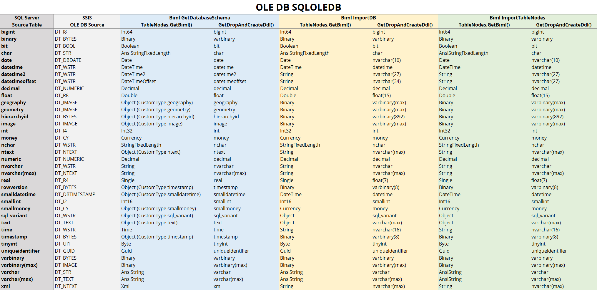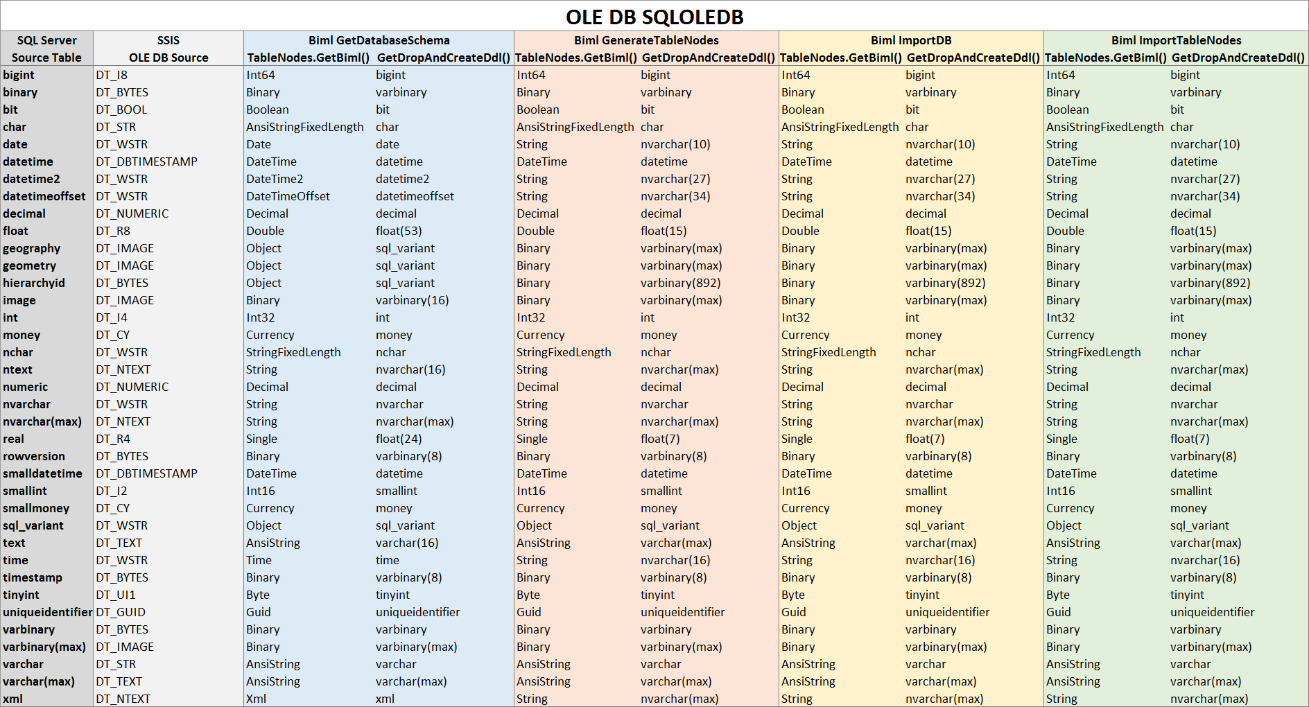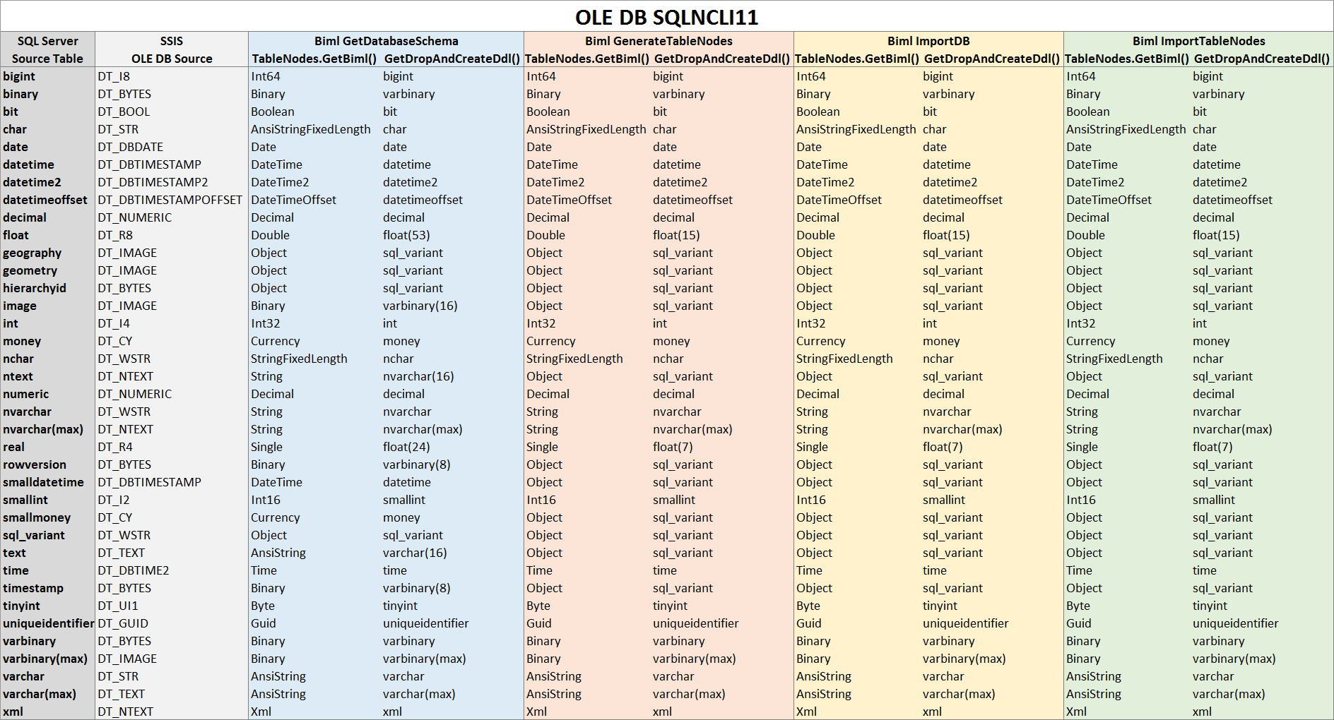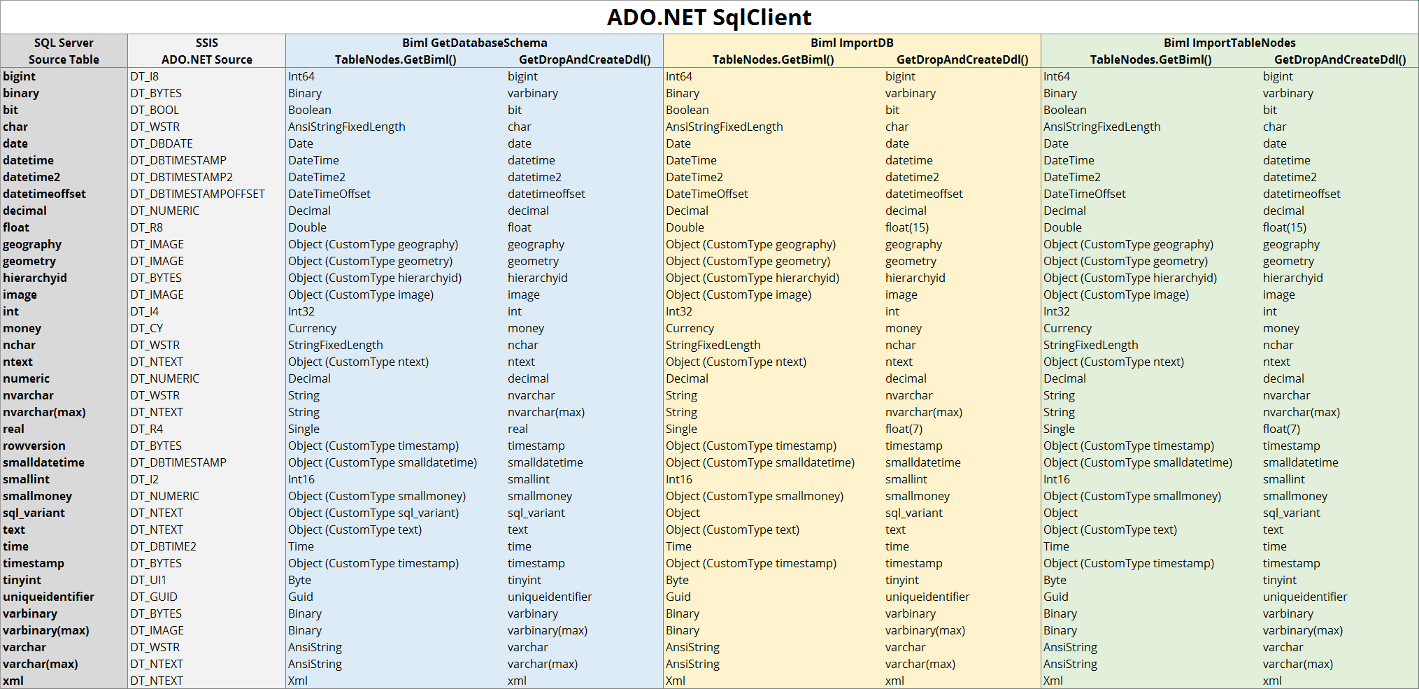 The table below is a simplified mapping between SQL Server, SSIS and Biml Data Types. It does not include all possible mappings or all data types, but is meant as a quick reference while developing and learning Biml. I mainly created it as a cheat sheet for myself, but I hope other Biml developers will find it useful!