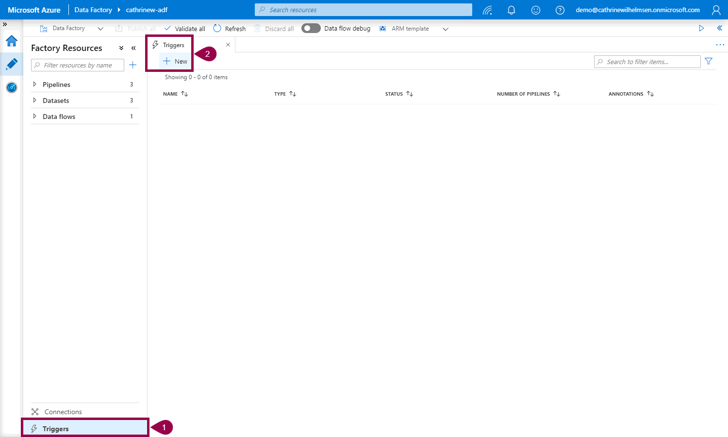 First, click Triggers. Then, on the linked services tab, click New: