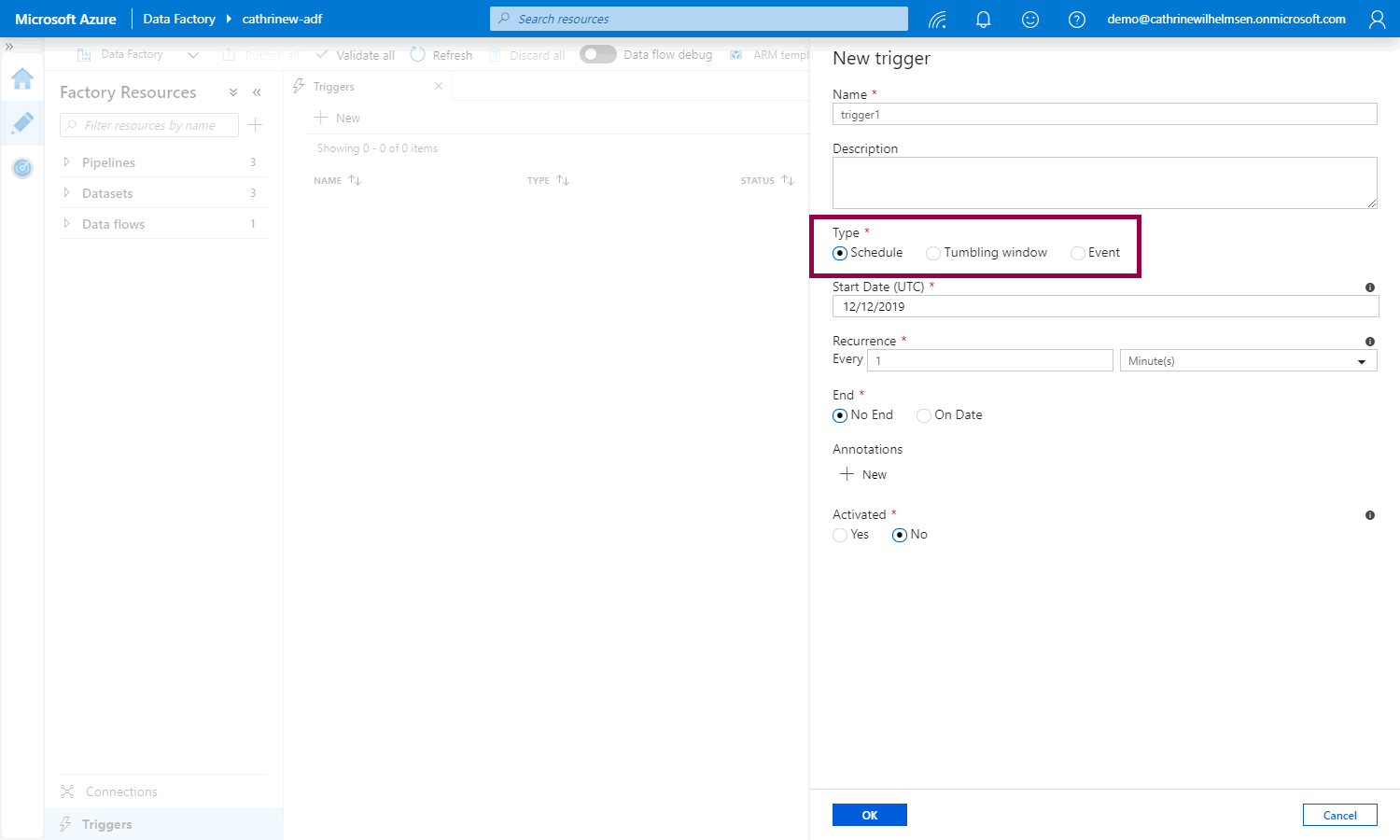 The New Trigger pane will open. The default trigger type is Schedule, but you can also choose Tumbling Window and Event: