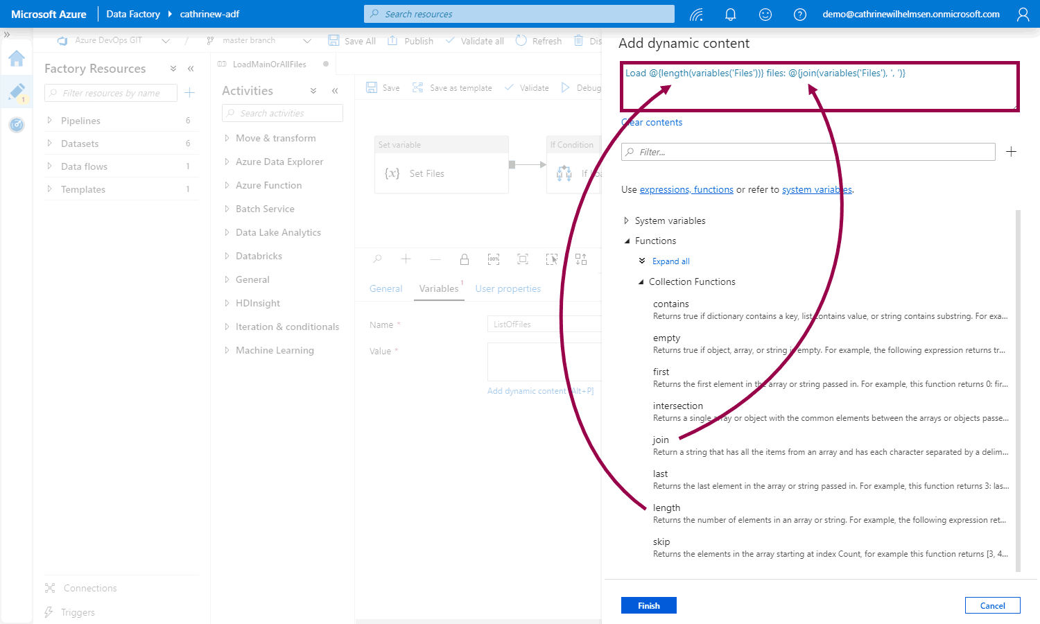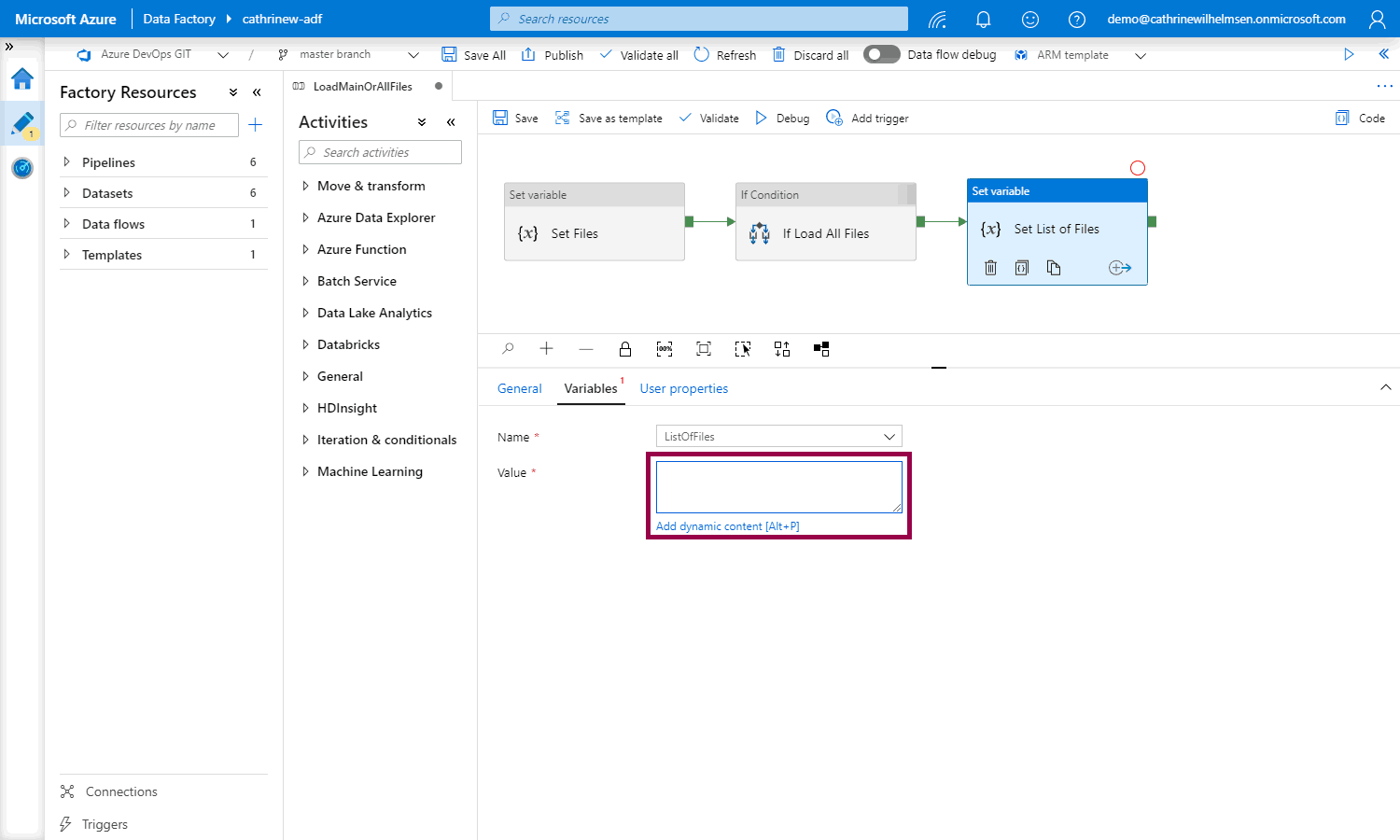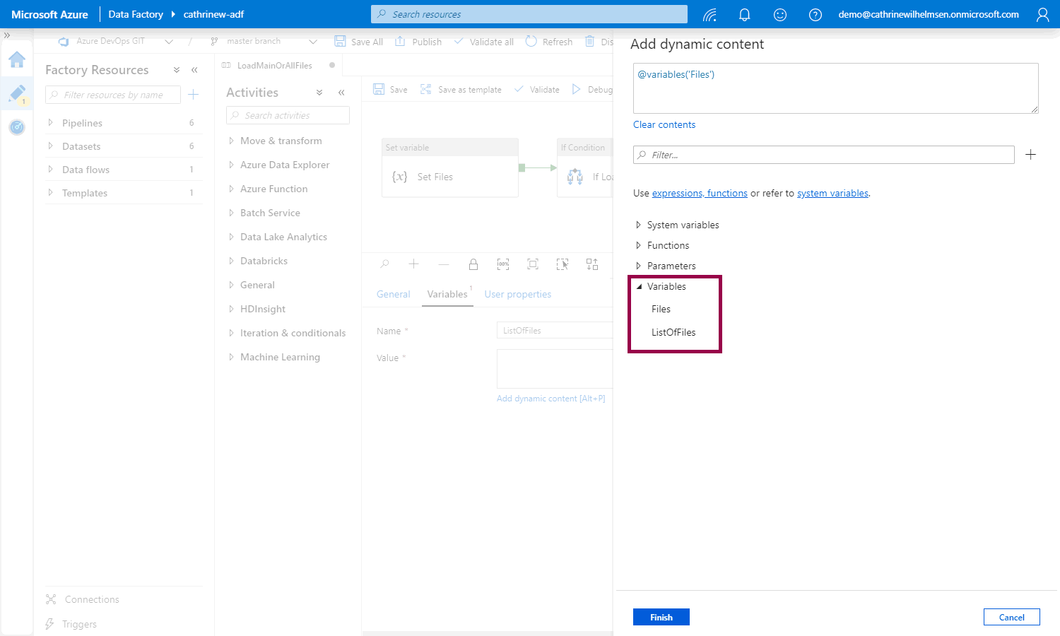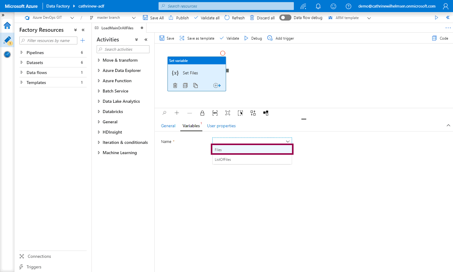 Add a new set variable activity, go to variables, and choose the Files variable:
