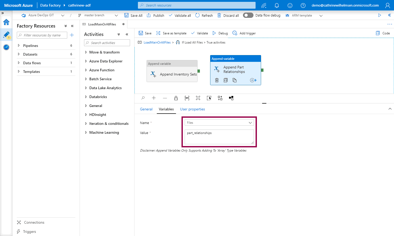 Inside the true activities, add an append variable activity. Choose the Files variable, and use the value “inventory_sets”: